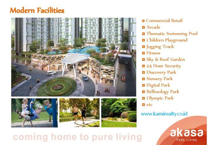 Apartemen Akasa adalah apartemen dengan fasilitas yang super lengkap baik fasilitas internal maupun fasilitas eksternal di sekitarnya. Anda-pun tak perlu repot keluar jauh-jauh dari apartemen Anda untuk memenuhi kebutuhan sehari-hari.