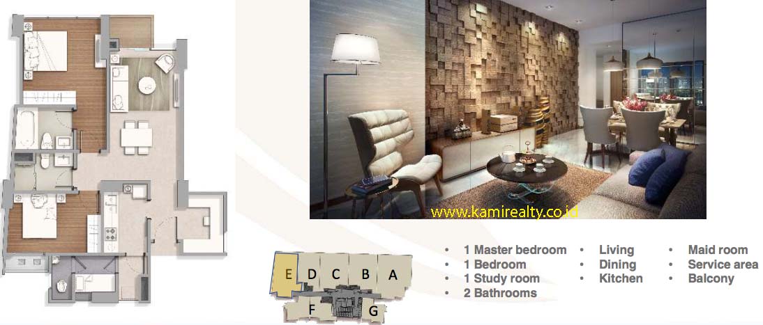 2+1 Bedroom premium seluas 110,61 m2. Saat ini show unit yang sudah tersedia