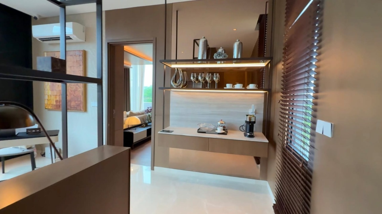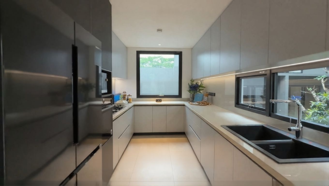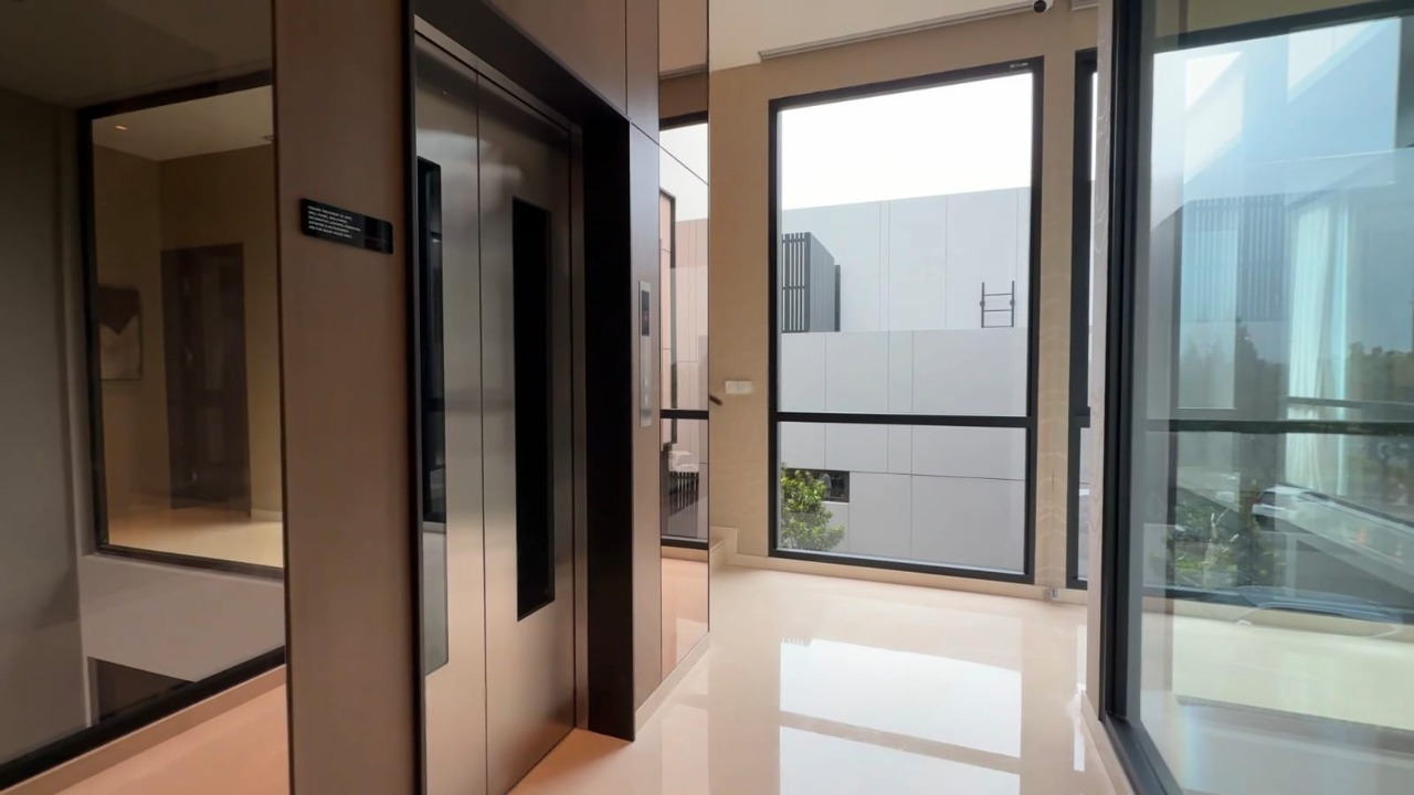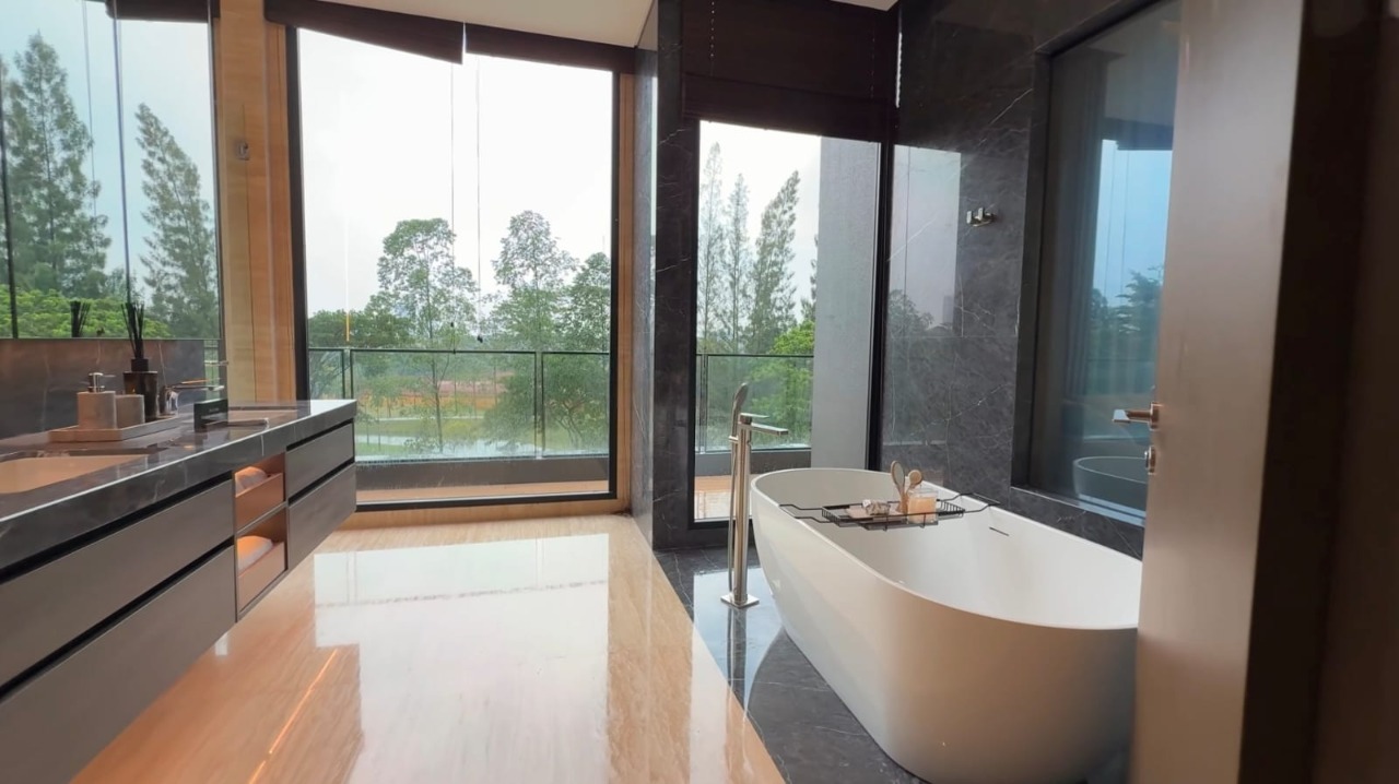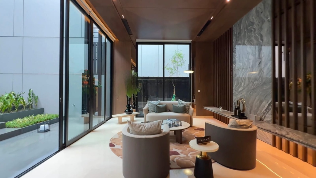 – Lantai marmer impor, SPC wood look di kamar tidur, dapur lengkap Gaggenau & Bosch, bathtub freestanding Kohler, serta façade aluminium screen & tiles 1200x2400mm.