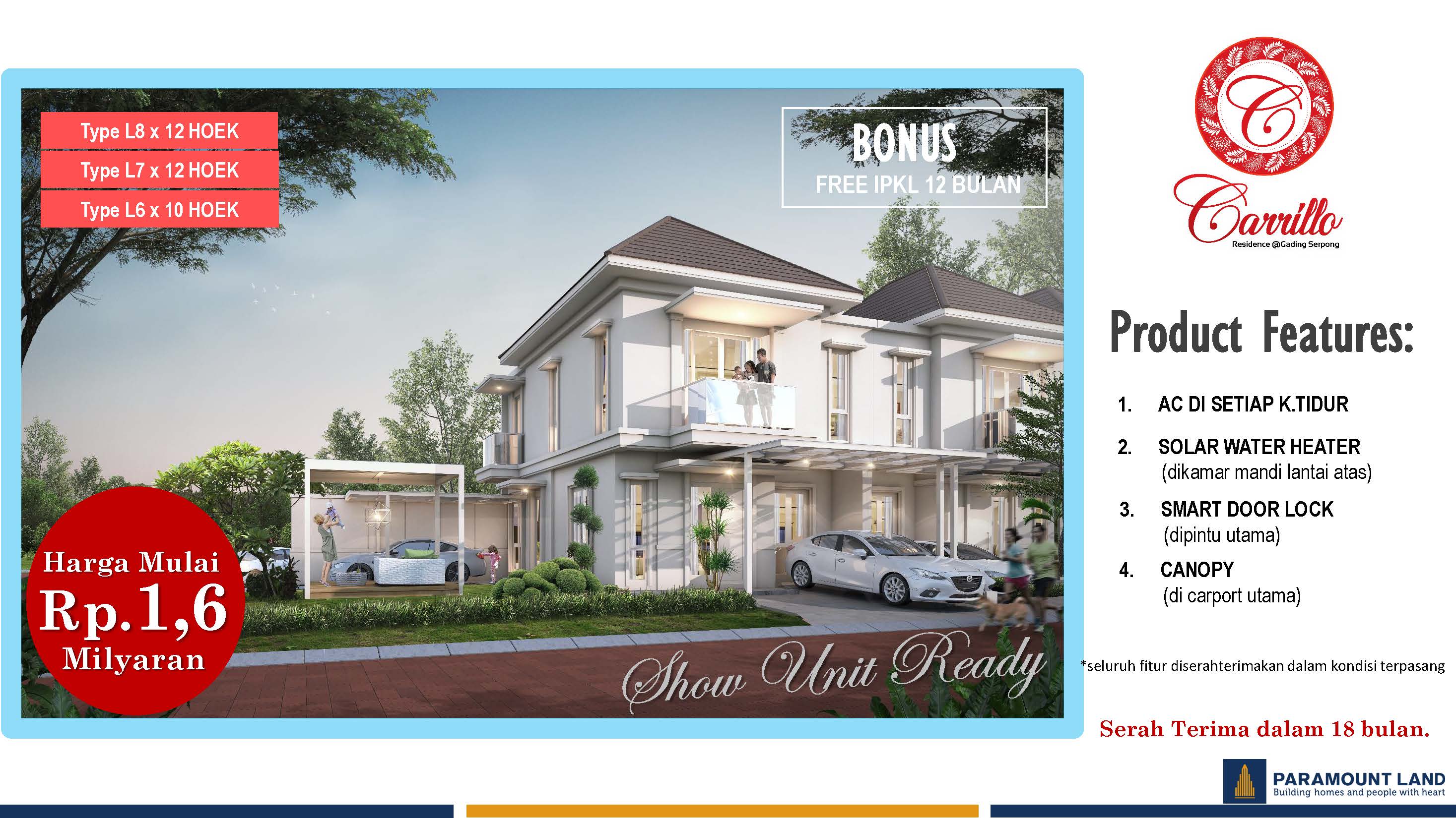 Carrilo Residence @Gading Serpong adalah hunian modern berkonsep Rumah Kembang hasil persembahan Paramount Land yang kini banyak diminati karena berdesain minimalis. Berada di lingkungan yang asri, dekat dengan perkotaan dan berbagai fasilitas yang sangat lengkap. Menjadikan Carrilo Residence sangat cocok untuk anda.