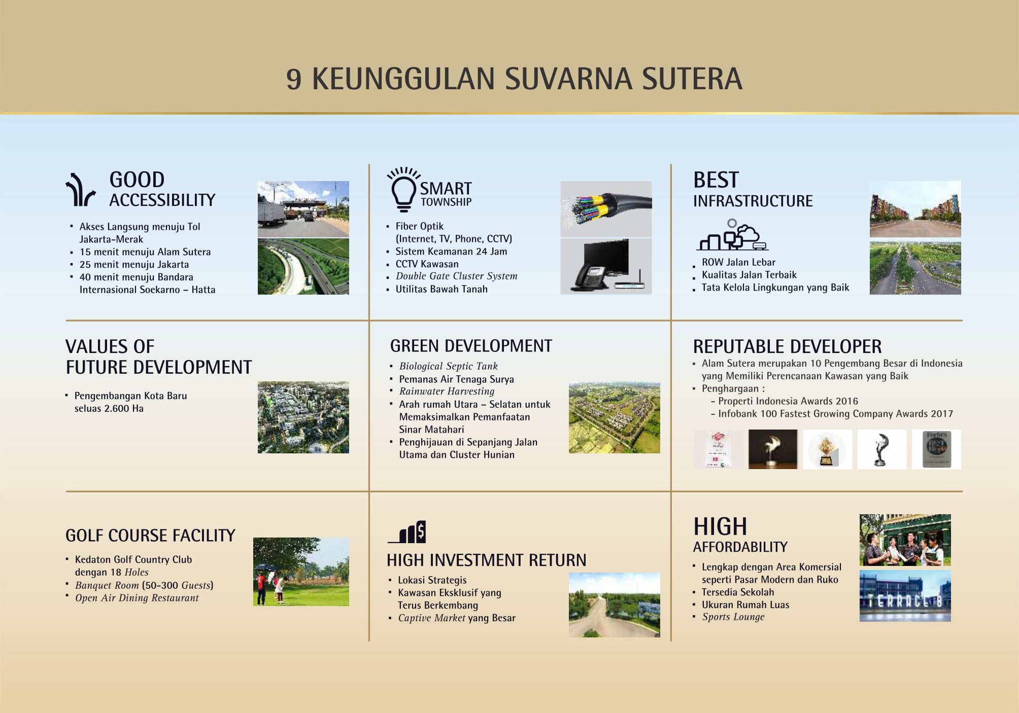 Cluster Eldora merupakan Cluster ke-6 di Supercluster Suvarna Sari, terletak sangat strategis cukup dekat dengan area Sekolah Santa Laurensia dan area komersial dan dilengkapi dengan fasilitas lengkap.