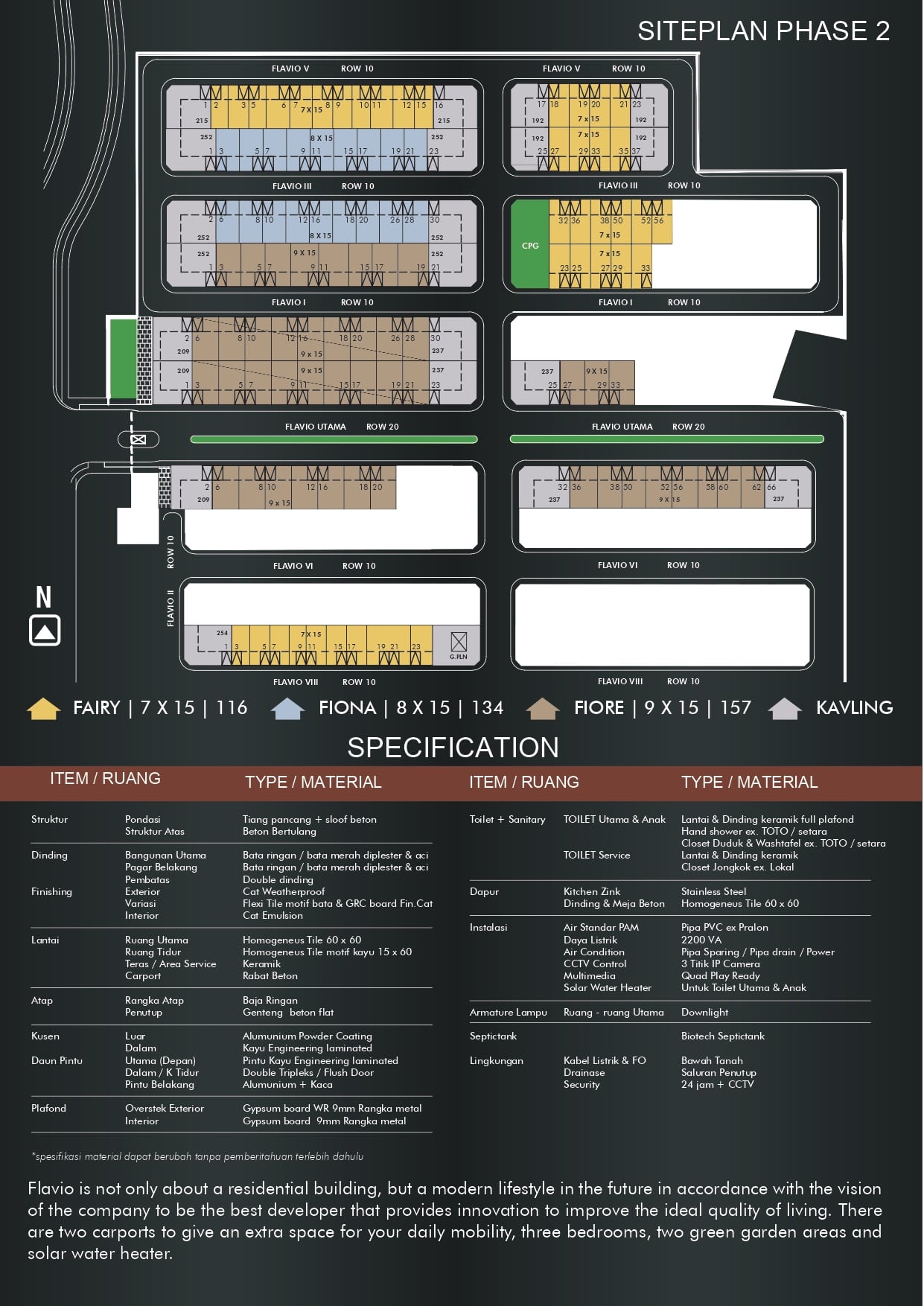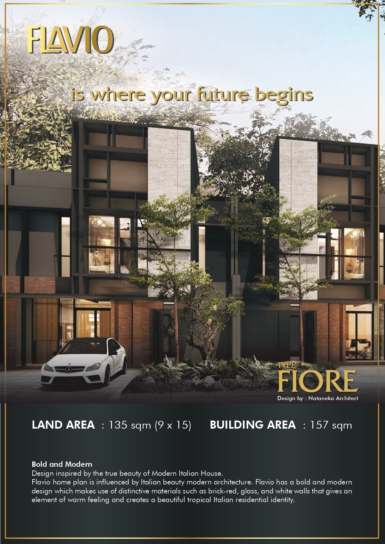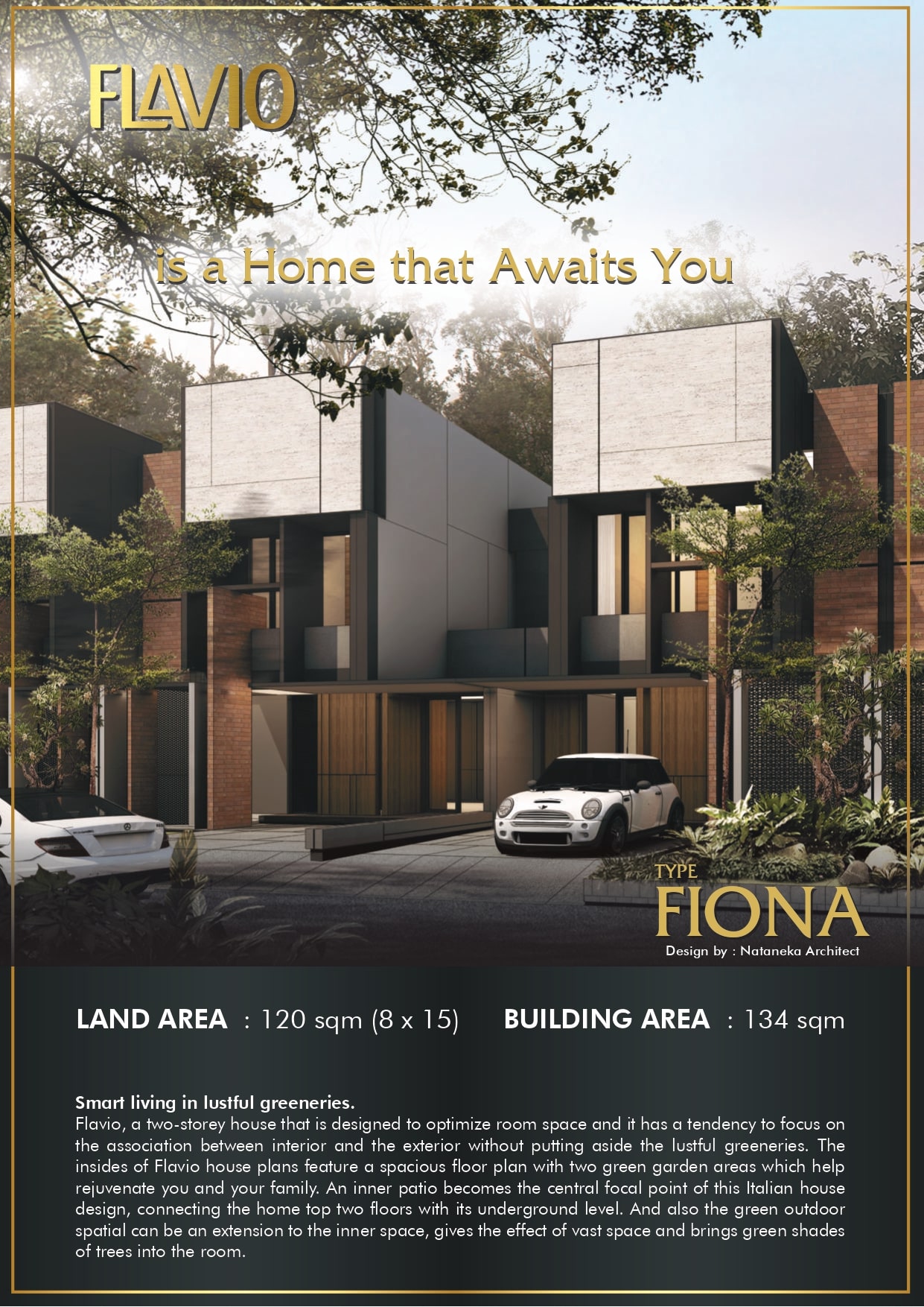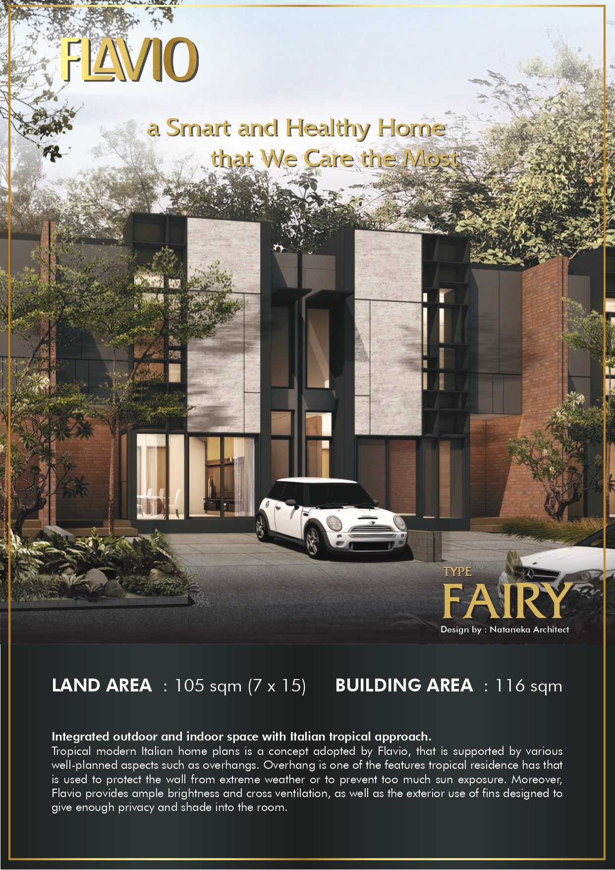 Flavio merupakan salah satu cluster yang terletak di dalam kawasan Suvarna Sari. Rumah dalam cluster Flavio didesign dengan tema Modern Italian yang dapat memanfaatkan lahan secara optimal tanpa membuang kesan keasrian serta dilengkapi dengan club house yang terletak dalam kawasan Suvarna Sari sehingga memberikan dapat kenyamanan lingkungan bagi para penghuni.