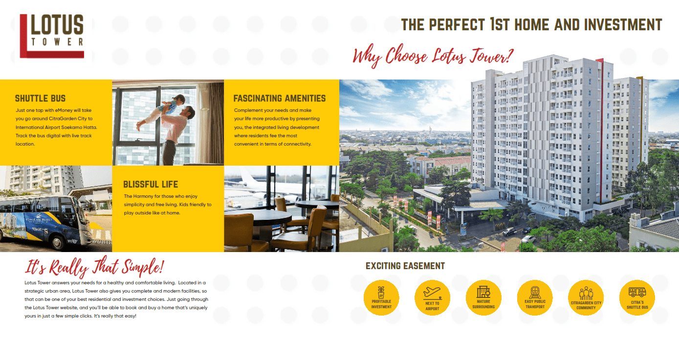 Tower Lotus merupakan pengembangan terbaru CitraGarden City Jakarta, dengan lokasi yang strategis dan dekat dengan bandara Soekarno-Hatta International Airport. Apartment di Jakarta Barat ini menghadirkan aksesibilitas dan kenyamanan di kawasan mixed-use development dengan kualitas internasional terbaik.