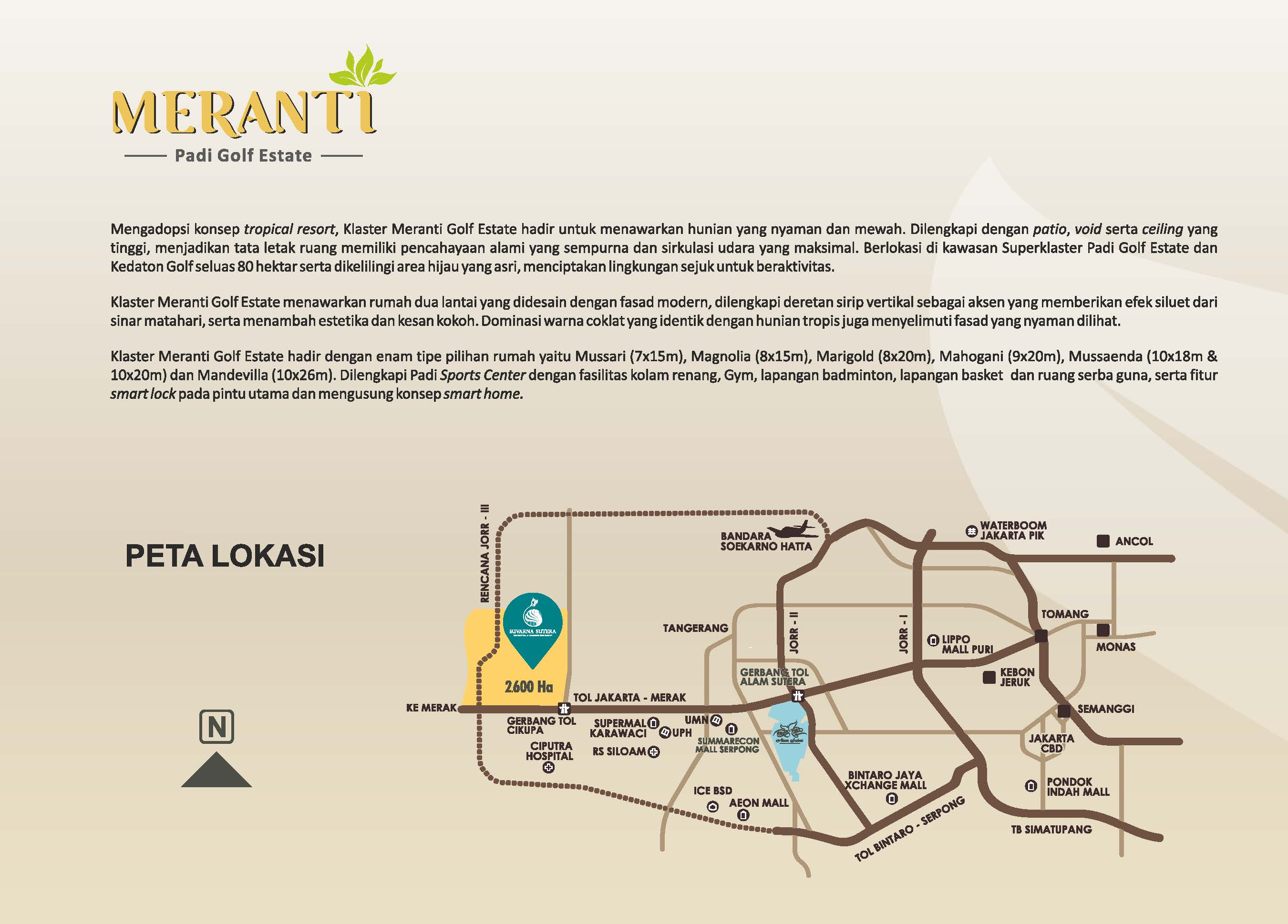 Klaster Meranti Padi Golf Estate merupakan kawasan hunian mewah dengan konsep Tropical Resort di Suvarna Sutera yang dilengkapi dengan patio, void serta ceiling yang tinggi untuk memaksimalkan sirkulasi udara di rumah anda. Hadir dengan berbagai fasilitas terbaik di Superklaster Padi Golf Estate, Suvarna Sutera.