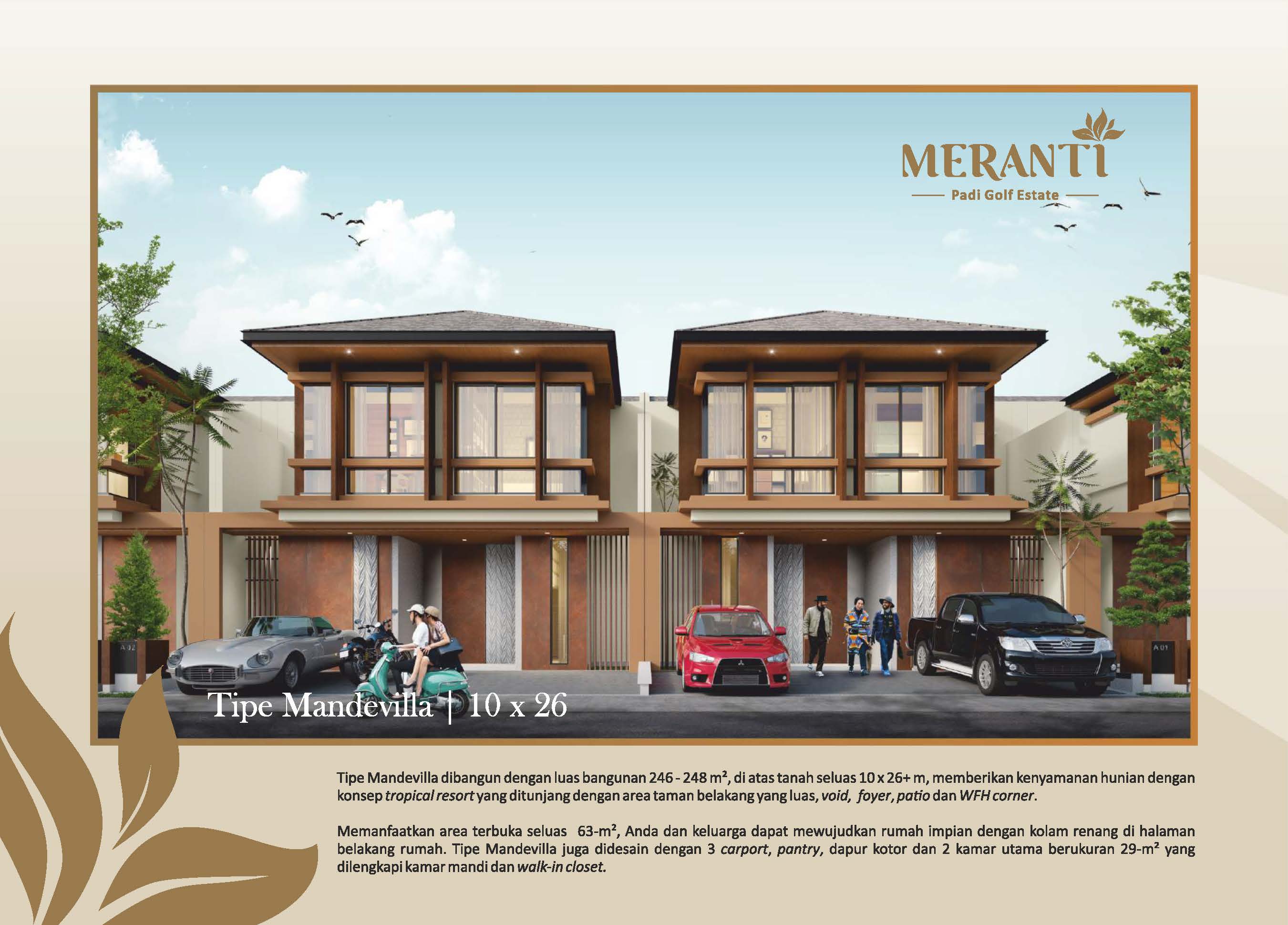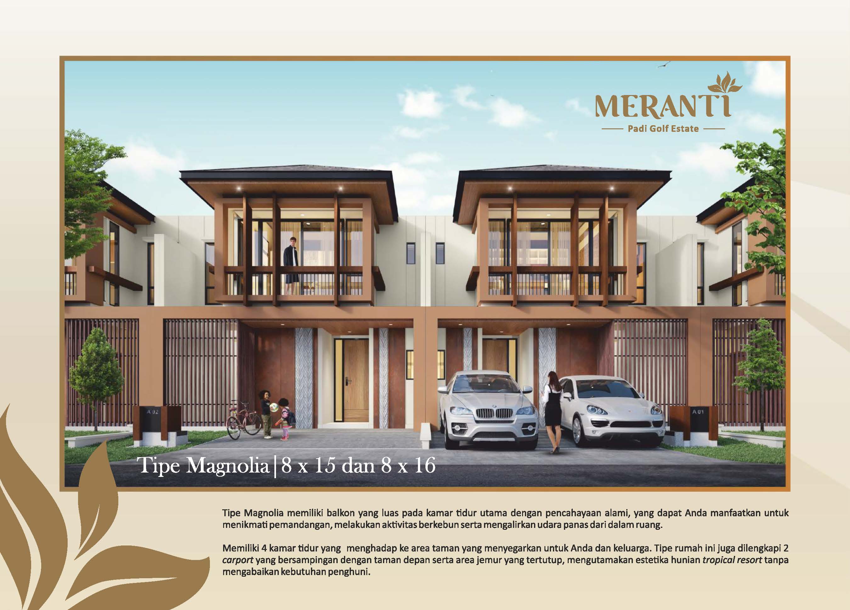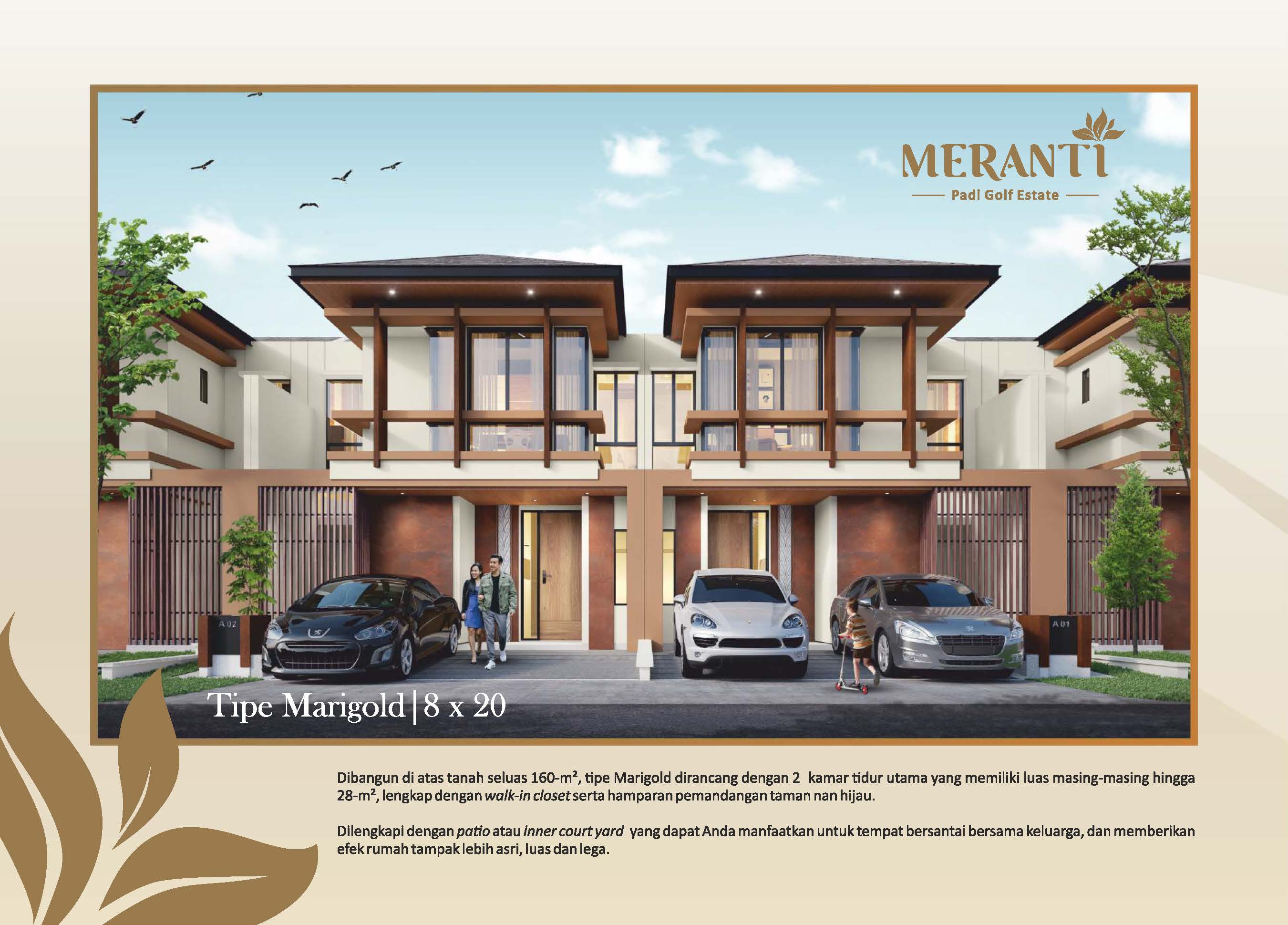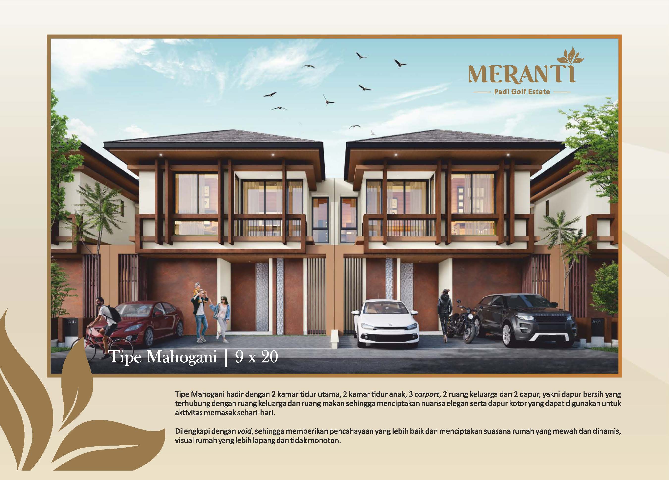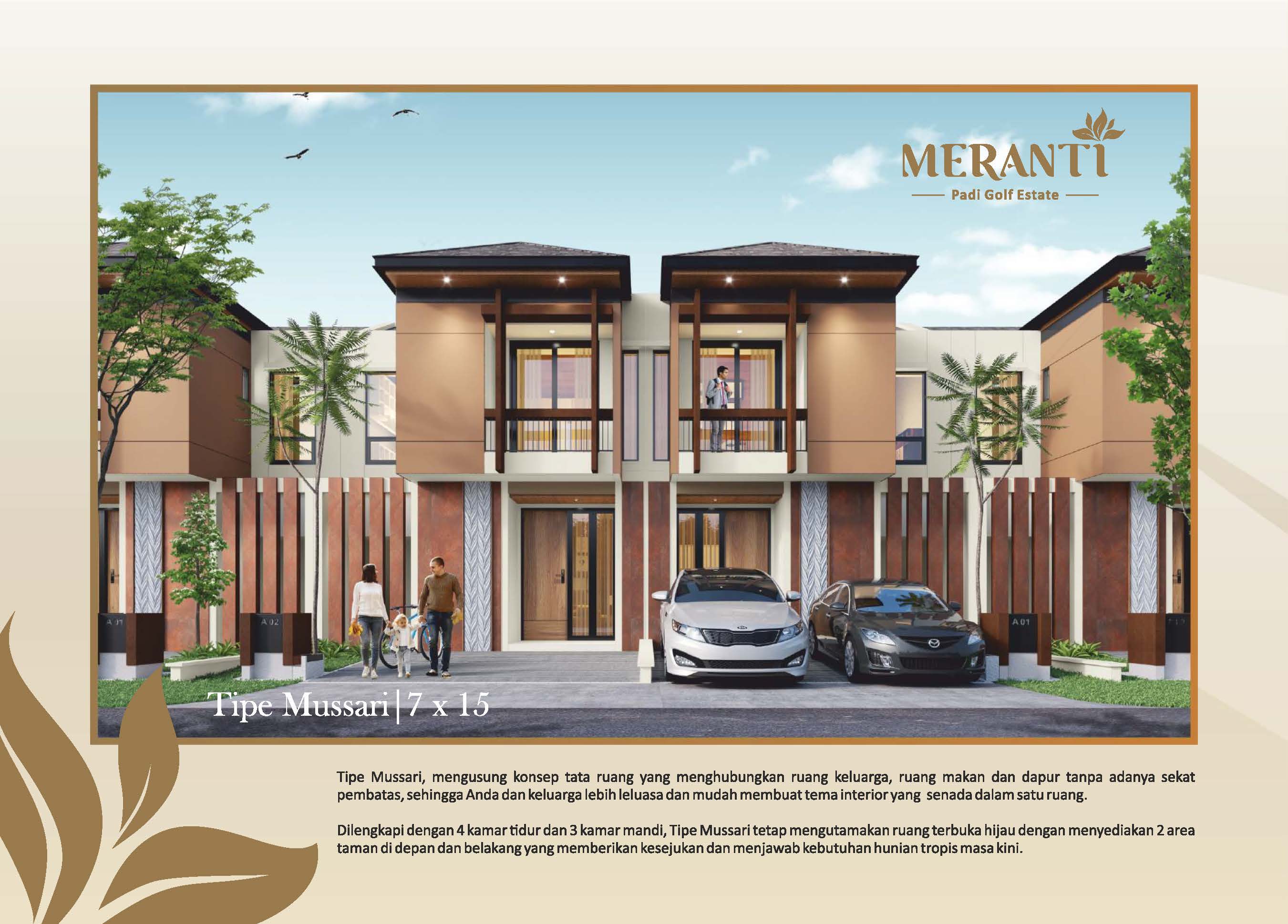 Klaster Meranti Golf menawarkan hunian mewah 2 lantai dengan fasad modern yang menambah aksen dari gaya arsitektur Meranti layaknya Tropical Resort.