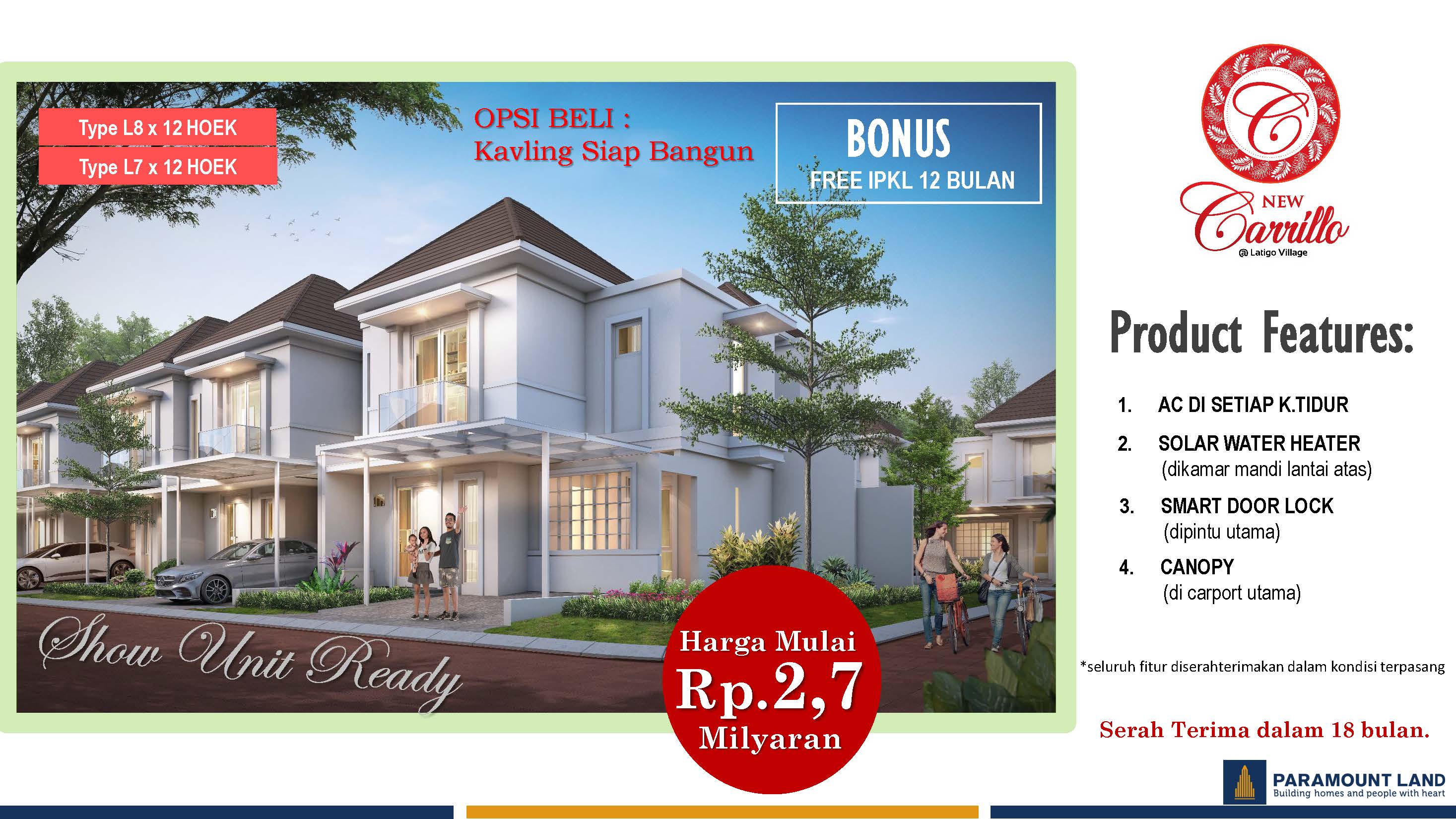 New Carrilo adalah hunian baru inovatif yang menawarkan konsep Rumah Kembang. Berada di Latigo Village, sebuah cluster berfasilitas lengkap yang telah menjadi lingkungan terbaik. Hunian inovatif ini berdesain modern dan minimalis.