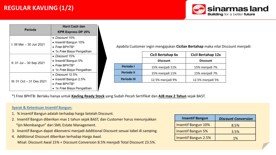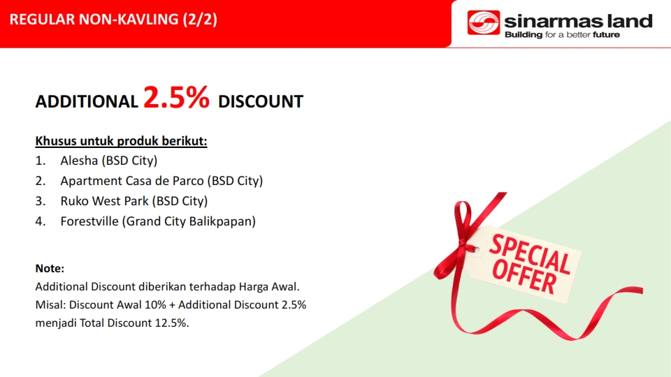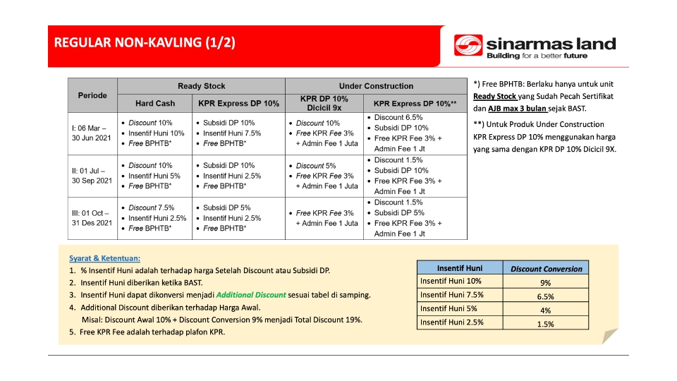 Melanjutkan Program Wish For Home (WFH) sebelumnya, Sinarmas Land kembali memberikan penawaran menarik untuk semua properti yang dipasarkan, termasuk hunian berupa rumah siap huni dan tanah kavling siap bangun, dengan memberikan diskon, subsidi DP bahkan Insentif Huni untuk pembelian properti . Besaran diskon hingga 10%, insentif huni sampai dengan 10%, ditambah free biaya akad KPR, dan lainnya.