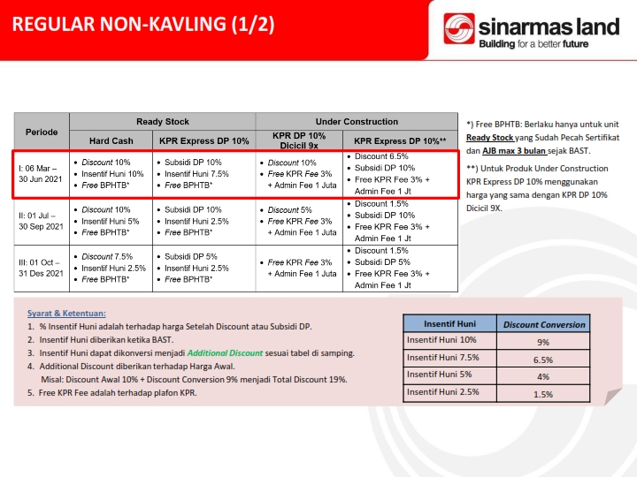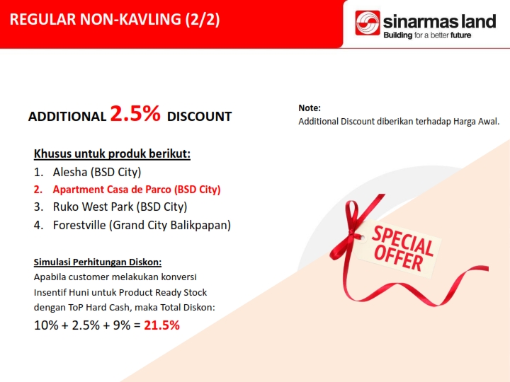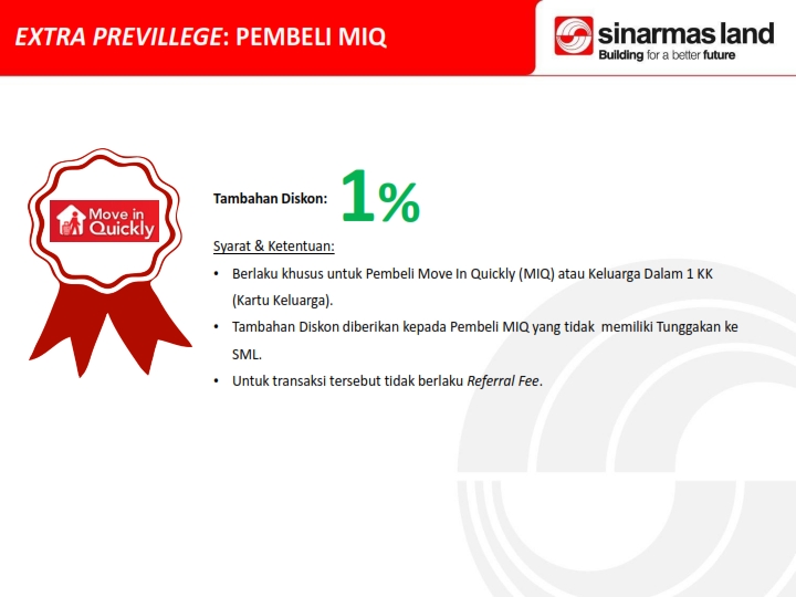 Melanjutkan Program Wish For Home (WFH) sebelumnya, Sinarmas Land kembali memberikan penawaran menarik untuk semua properti yang dipasarkan, termasuk commercial building berupa ruko dan perkantoran, dengan memberikan diskon, subsidi DP bahkan Insentif Huni untuk pembelian properti . Besaran diskon hingga 10%, insentif huni sampai dengan 10%, ditambah free biaya akad KPR, dan lainnya.