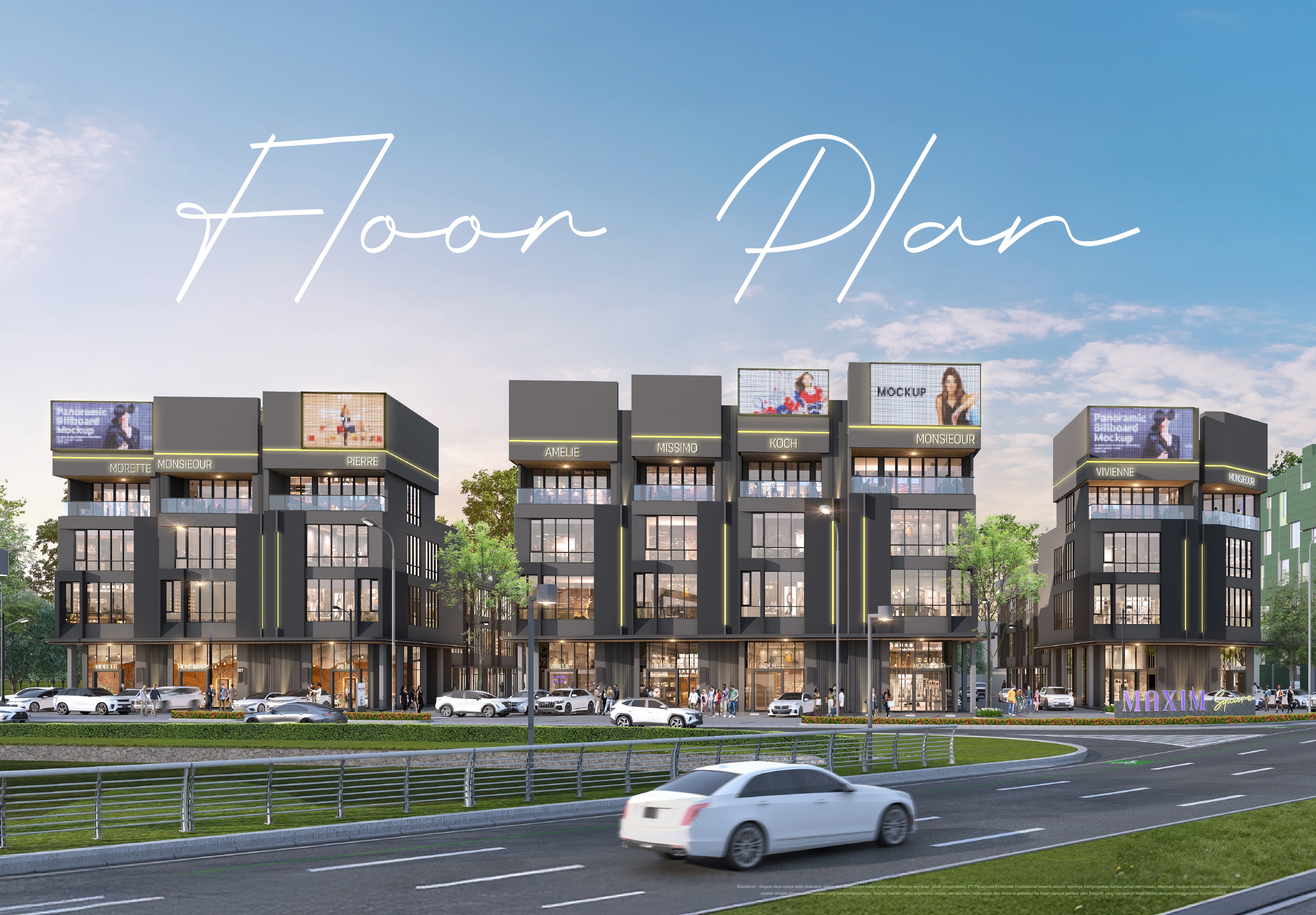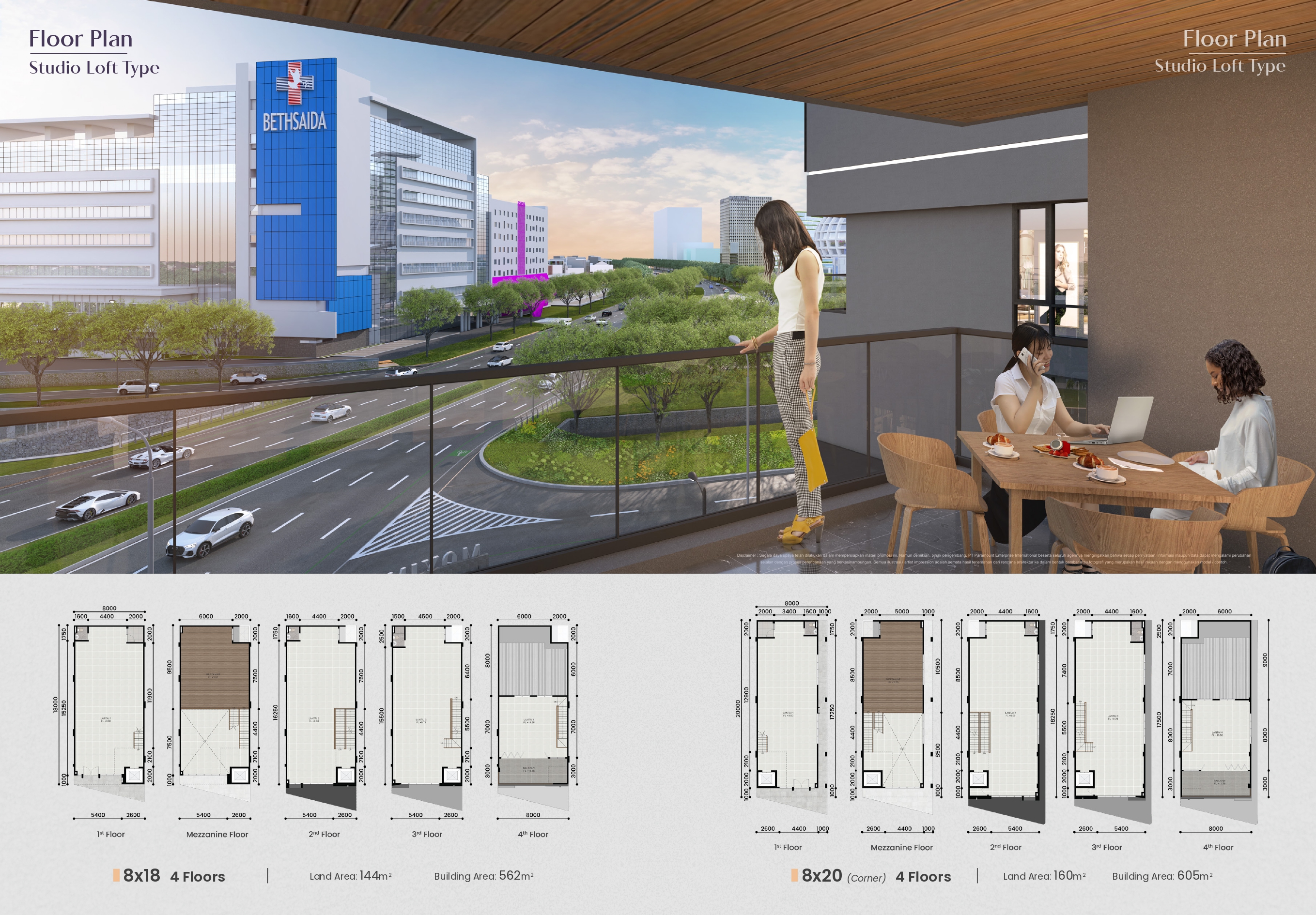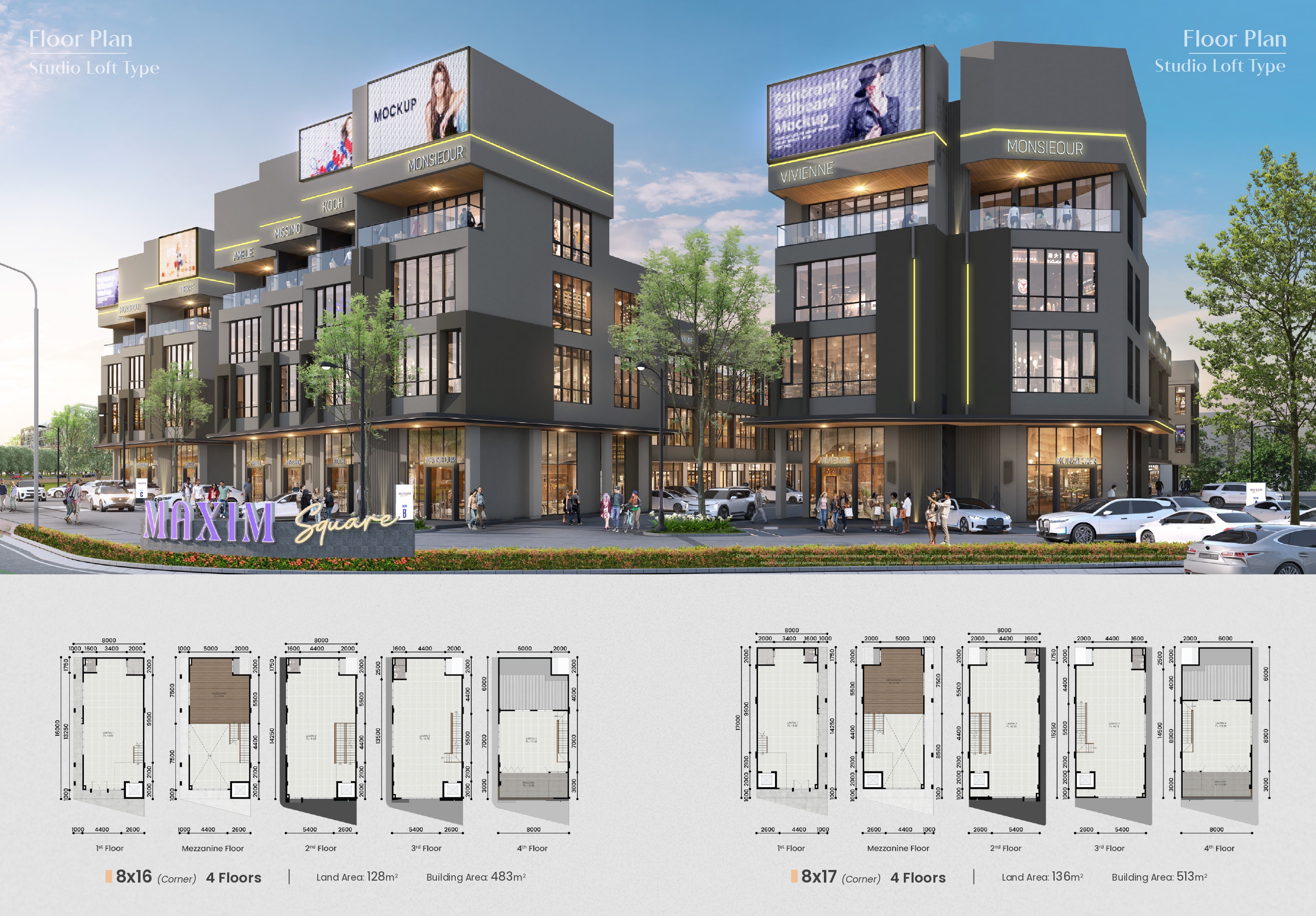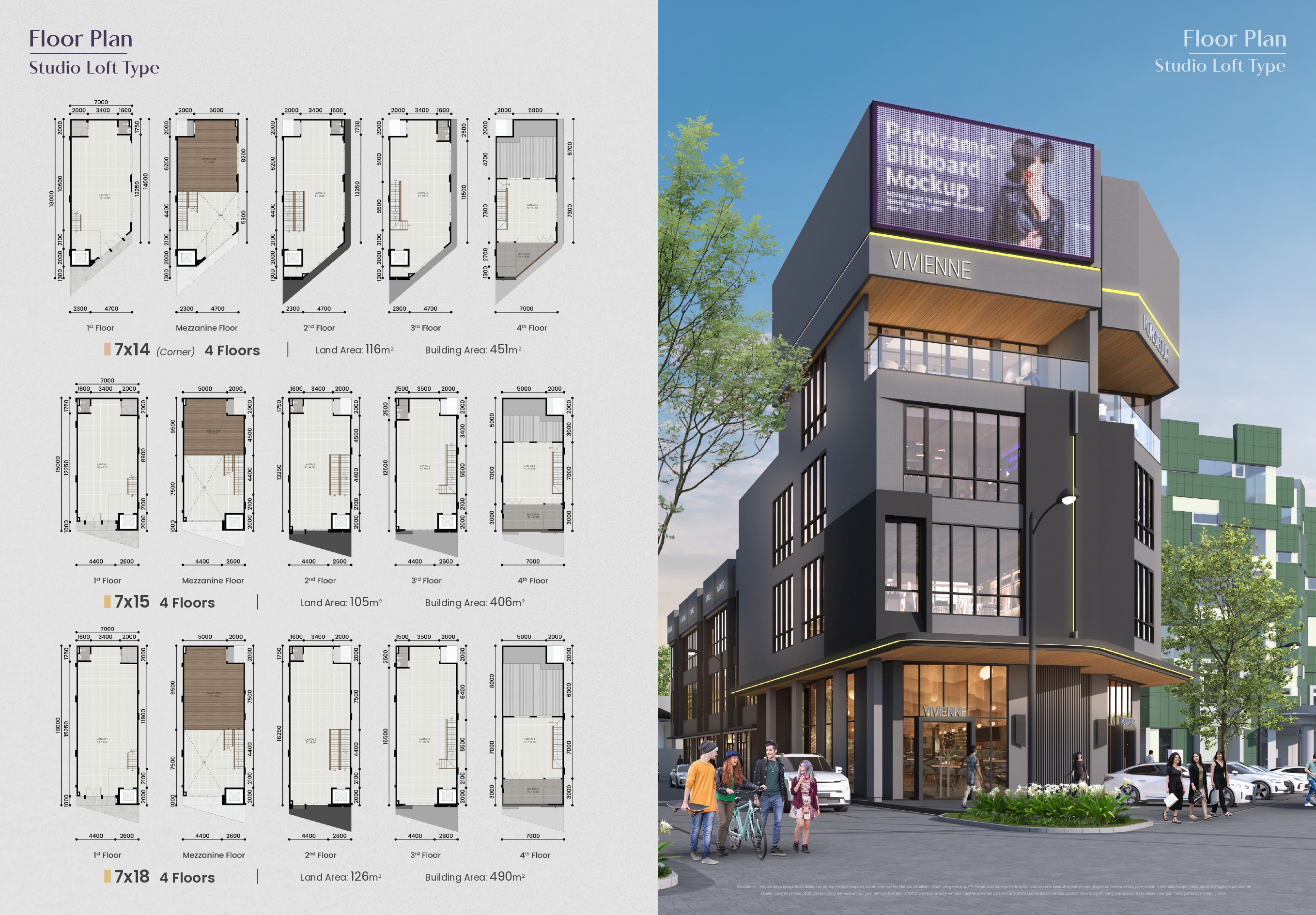 – Fitur utama: rooftop, mezzanine, lift (Studio Loft), double volume ceiling, videotron-ready facade