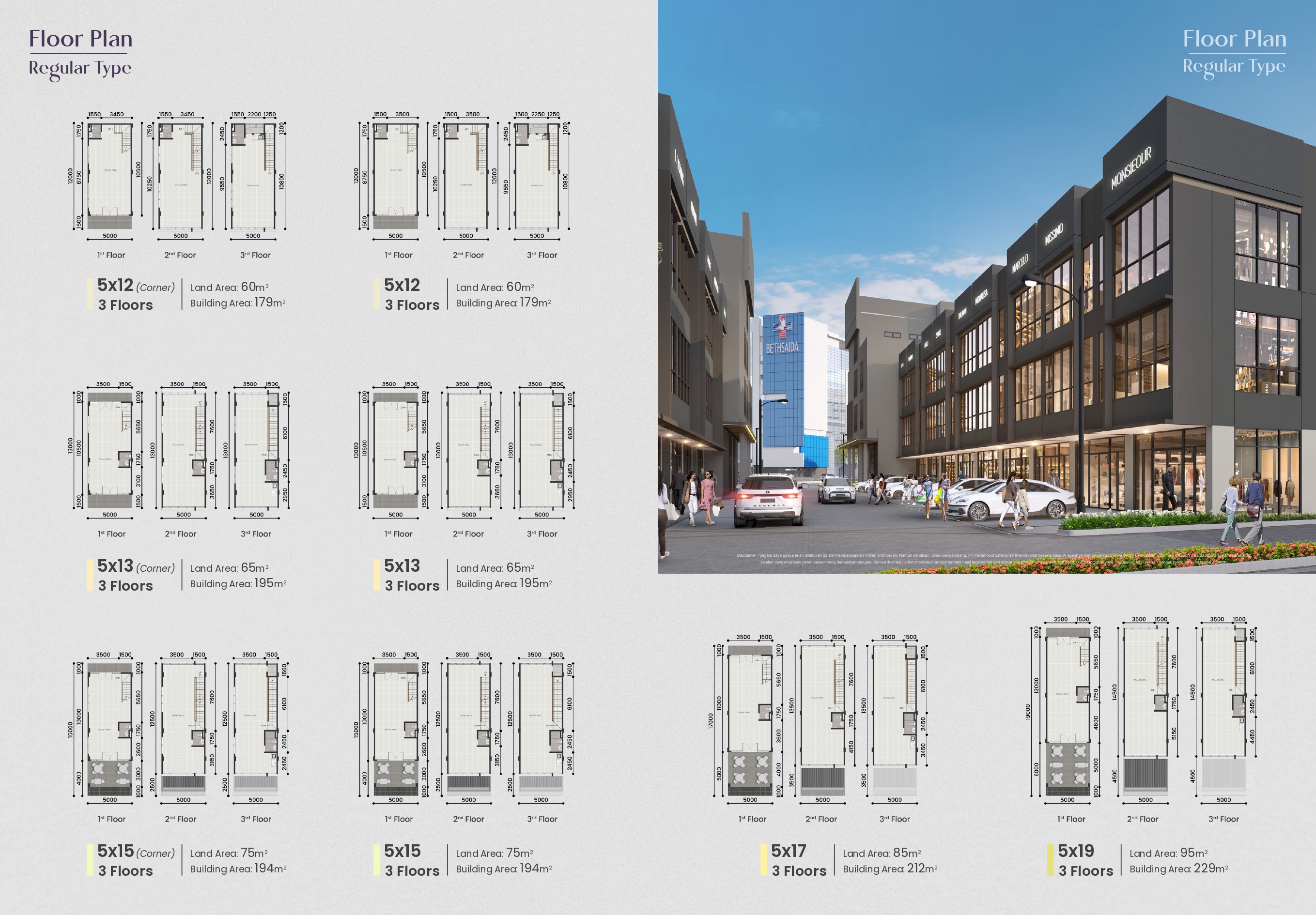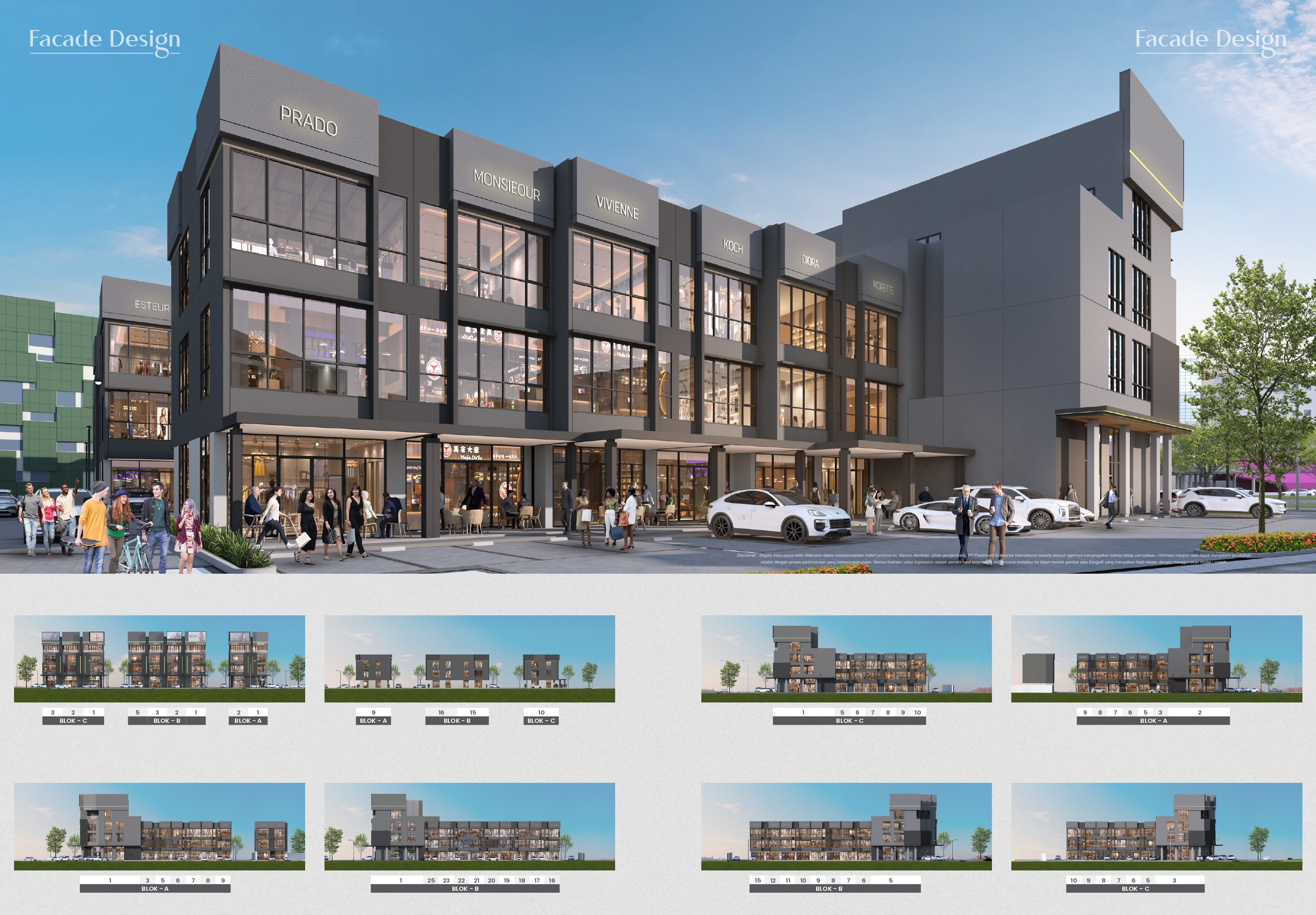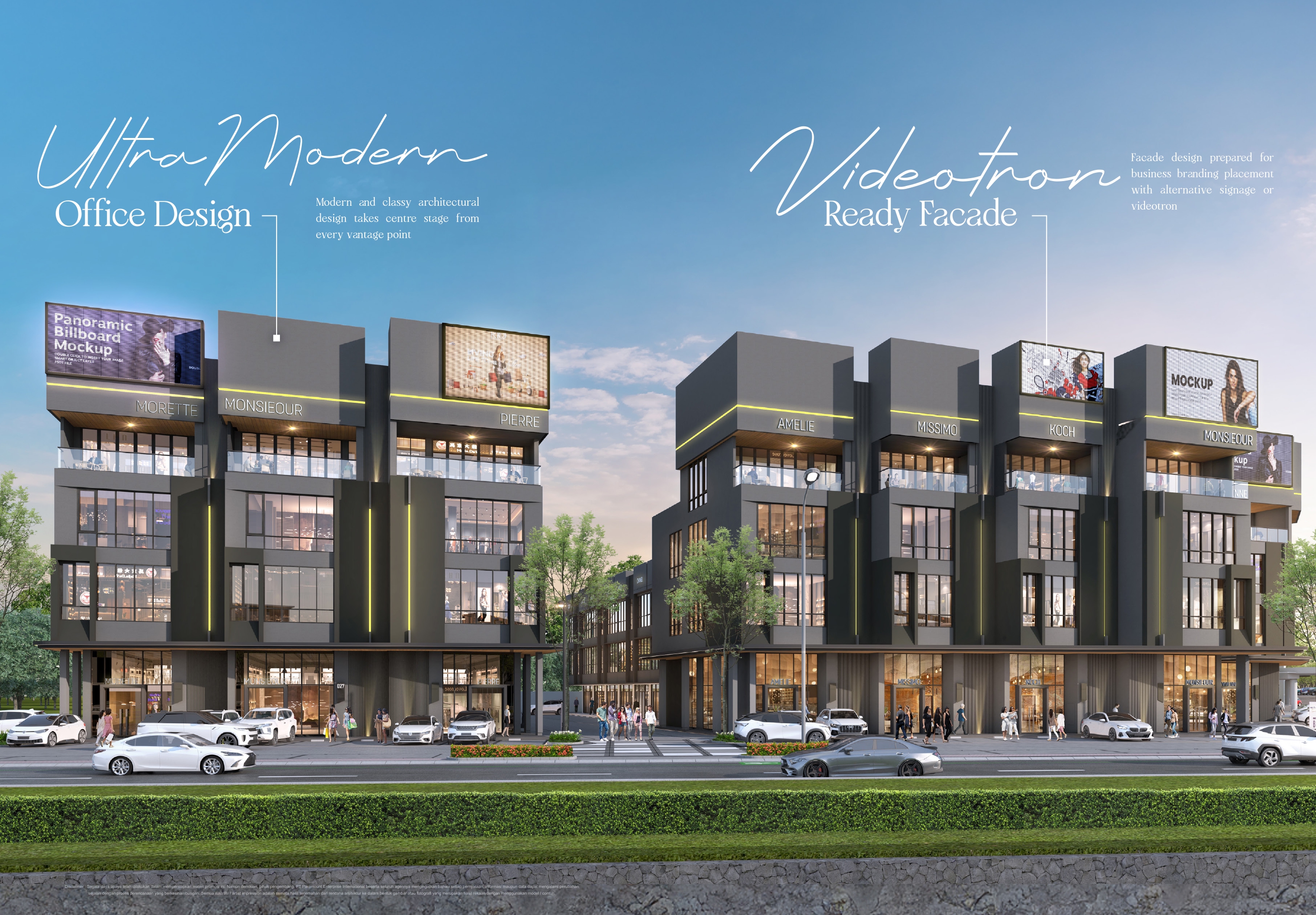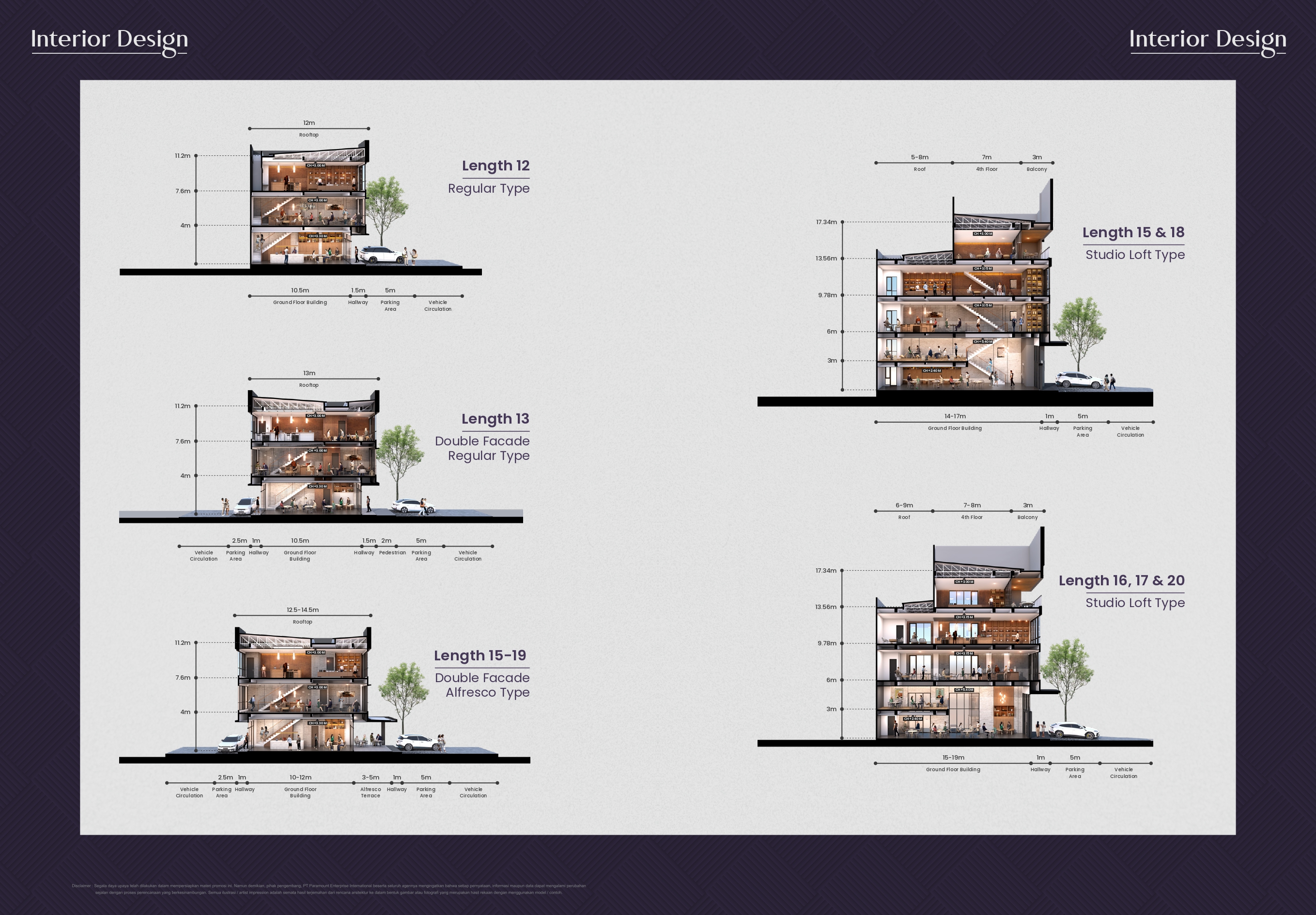 – Fitur utama: rooftop, mezzanine, lift (Studio Loft), double volume ceiling, videotron-ready facade