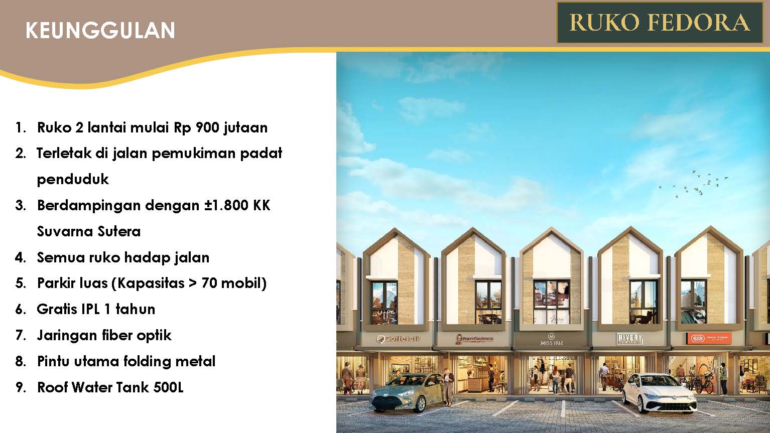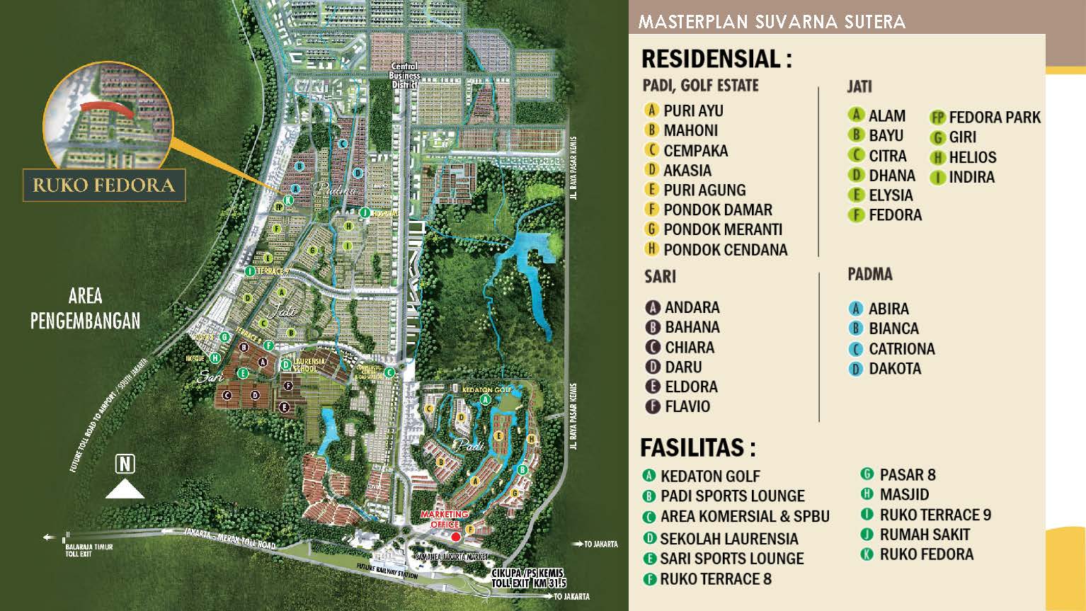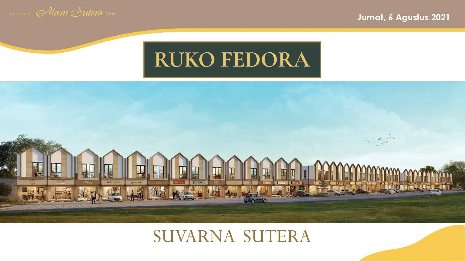 Suvarna Sutera kota baru seluas 2.600 hektar di Tangerang yang mudah dijangkau dengan akses tol langsung, hanya berjarak 30 menit dari Jakarta dan dikembangkan oleh Alam Sutera Group menghadirkan area komersial terbaru, RUKO FEDORA.