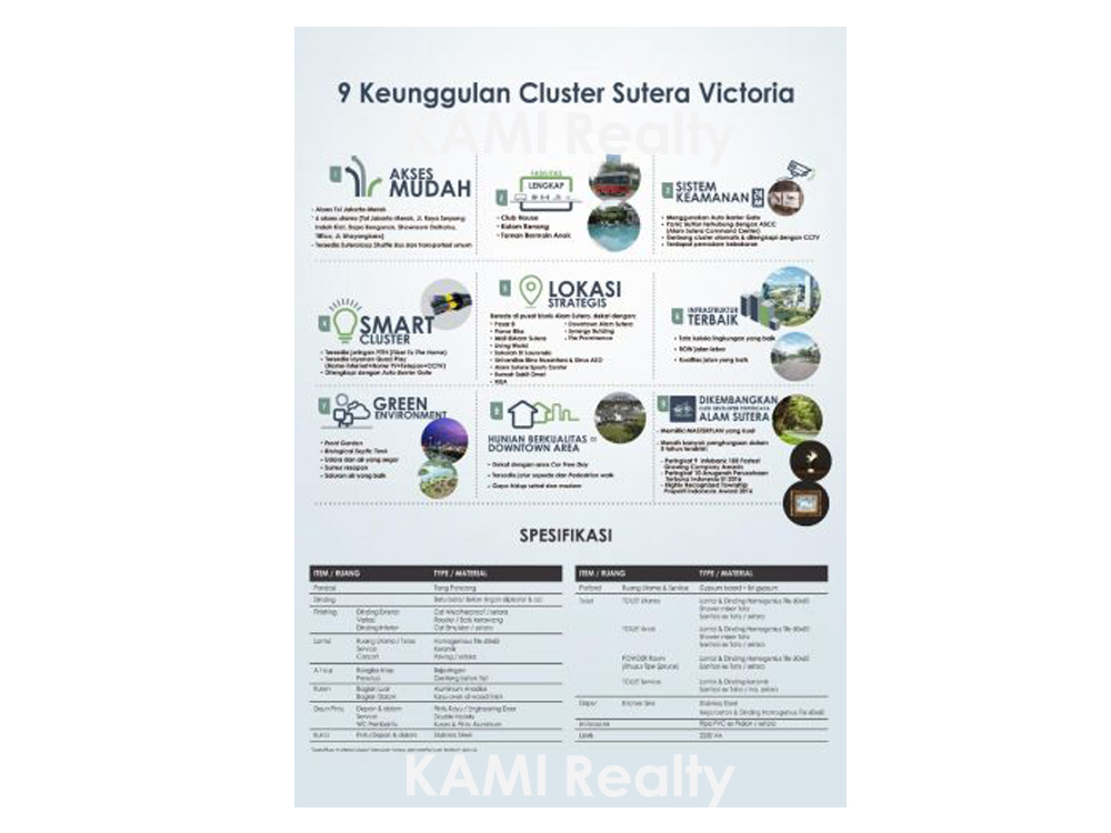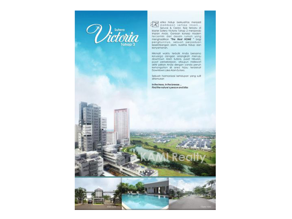 Sutera Victoria Tahap III menjawab impian Anda. Goresan konsep modern tercermin dari desain rumah yang menghadirkan “The Real HOME “ bagi penghuninya, sebuah perpaduan keseimbangan alam, kualitas hidup dan kenyamanan. Nikmati waktu terbaik Anda bersama keluarga dengan selangkah menuju Downtown Alam Sutera, pusat perbelanjaan, pusat pendidikan ataupun melewati akhir pekan Anda dengan canda dan keakraban di area hijau terdekat Downtown Lake Alam Sutera. Sebuah harmonisasi kehidupan yang sulit ditemukan. Demi kenyamanan penghuni, Sutera Victoria Tahap 3 dilengkapi dengan berbagai macam fasilitas, di antaranya Club House, Kolam renang, dan taman bermain anak.