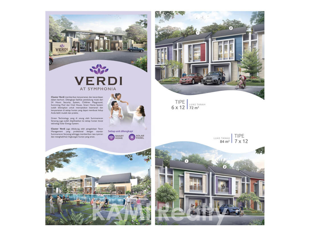 Lokasi cluster VERDI terletak dikawasan premium SYMPHONIA, dengan dikelilingi oleh keindahan danau yang lengkap dengan sarana pendukung untuk aktivitas dan eksplorasi setiap penghuninya, seperti club house, kolam renang dan children playground.