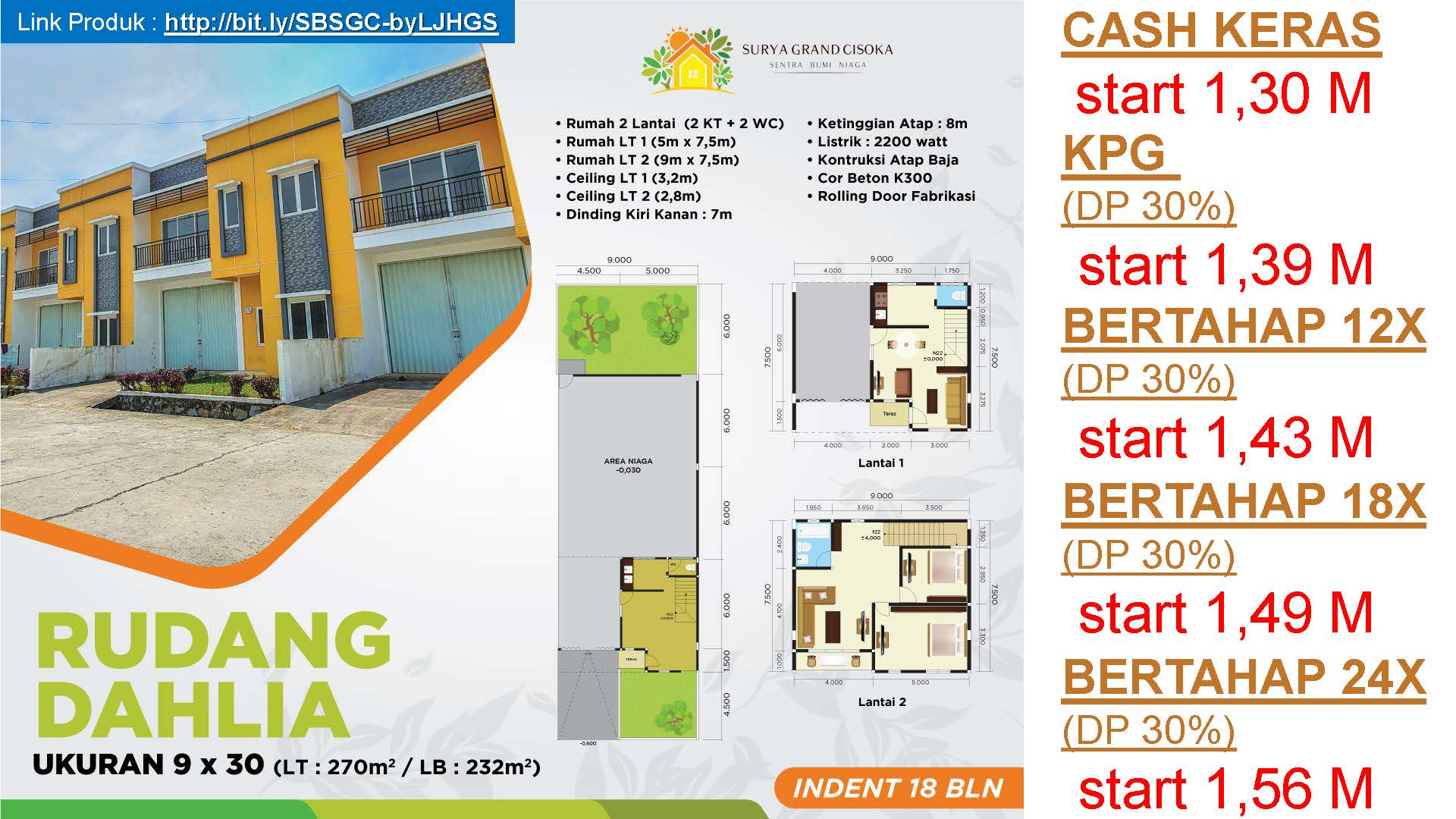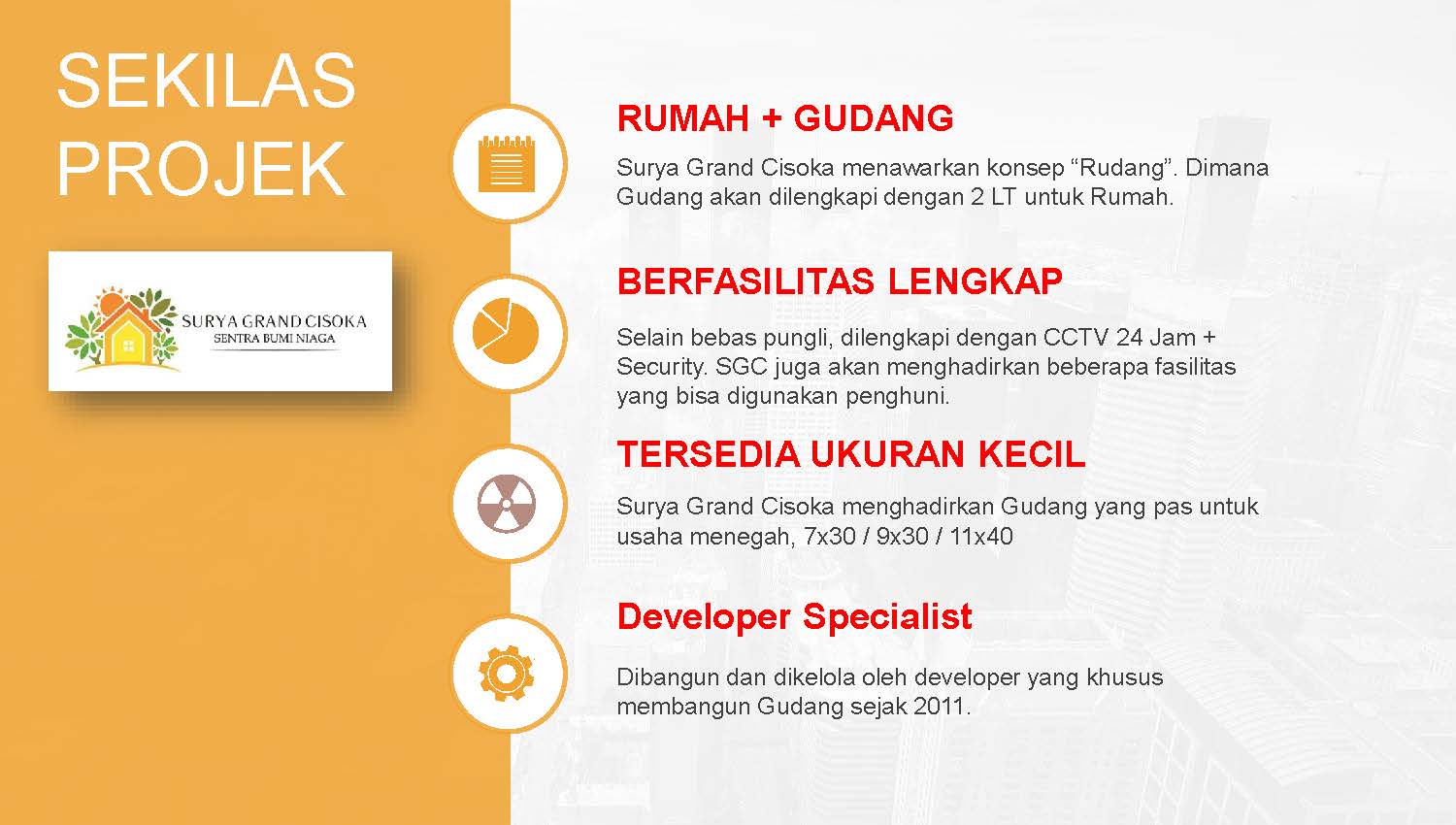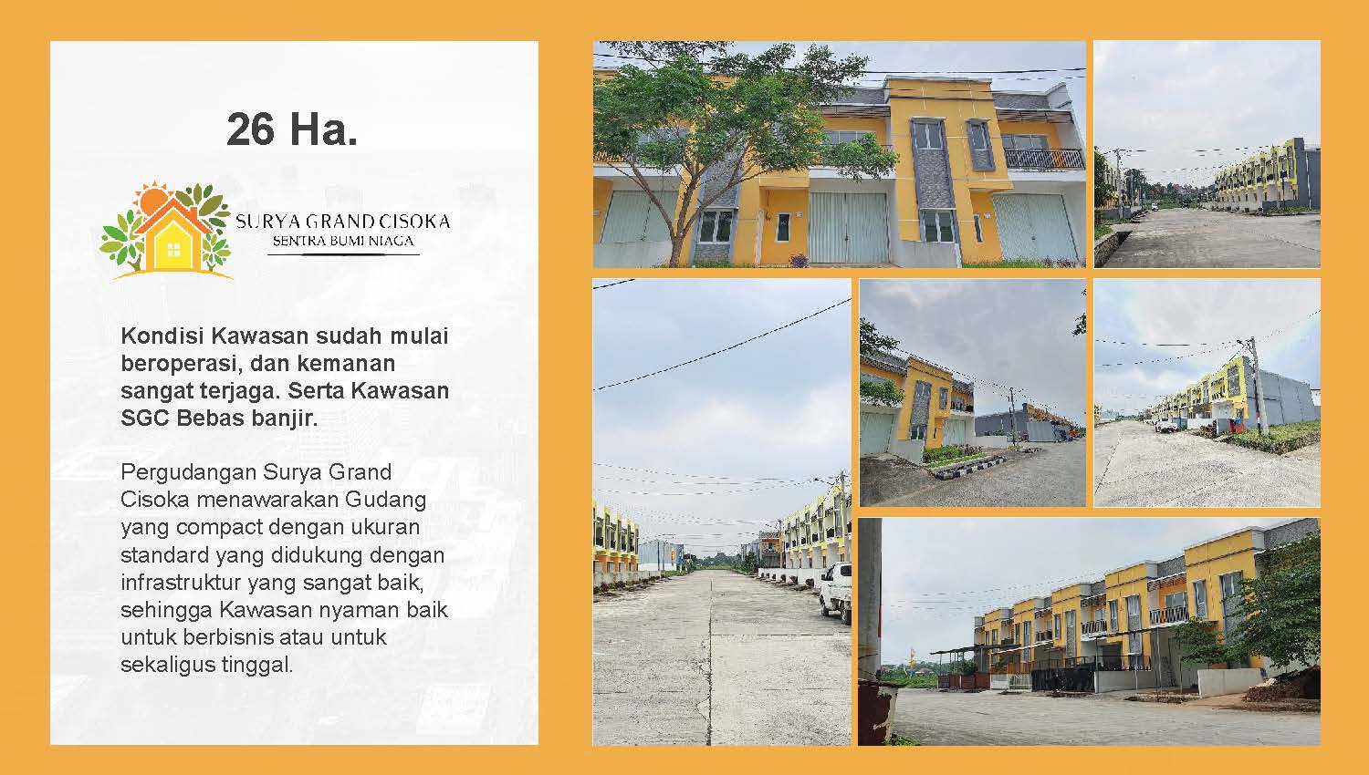 KamiRealty.co.id – Surya Grand Cisoka menawarkan sebuah konsep Rumah + Gudang(RUDANG) yang dilengkapi 2 lantai untuk rumah. Memiliki fasilitas lengkap, keamanan 24 jam, bebas pungli dan kawasan bebas banjir. SGC juga akan menghadirkan banyak fasilitas yang dapat digunakan penghuni.