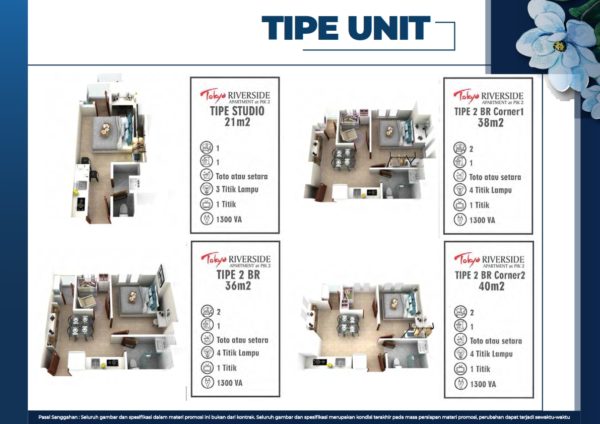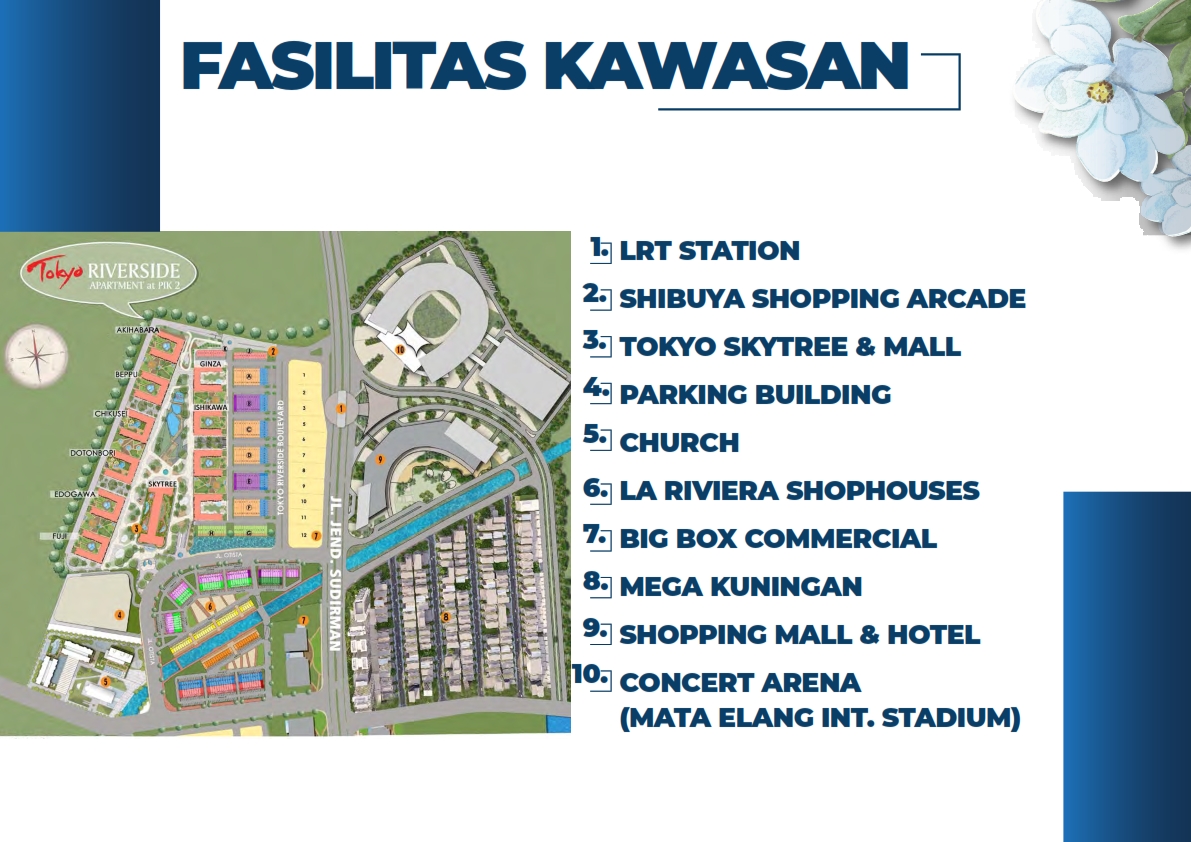 Apartemen Tokyo Riverside adalah sebuah apartemen exclusive dengan fasilitas yang menunjang gaya hidup perkotaan yang praktis dan nyaman. Tokyo Riverside saat ini telah dibuka tower ke-7 (Tower Ginza), dimana 6 tower sebelumnya telah sold out, yaitu di antaranya Tower Akihabara, Tower Beppu, Tower Chikusei, Tower Dotonbori, Tower Edogawa, dan Tower Fuji. Didesain oleh konsultan arsitektur kelas dunia, Tokyo Riverside memiliki konsep Japanese Modern Living Style dengan ruangan compact dan multifungsi yang dekat dengan alam.